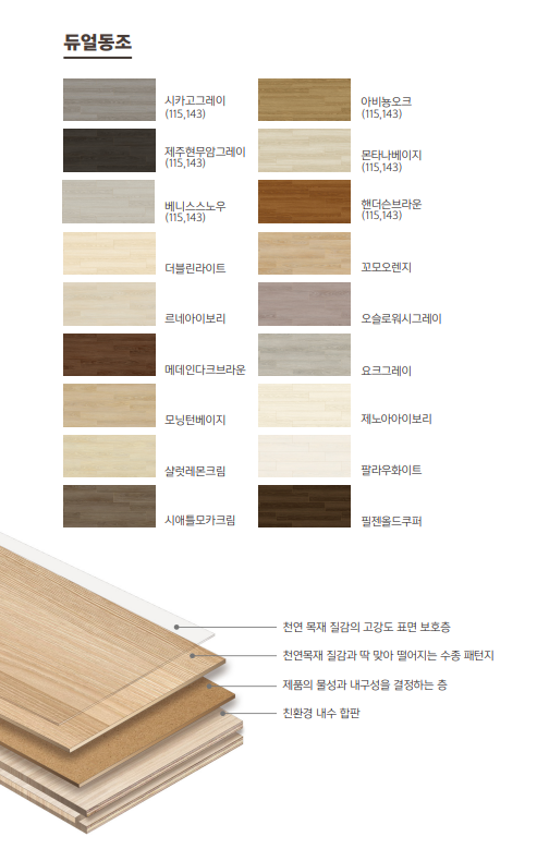 장점 | * 광폭마루 * 3세대 동조엠보싱 공법 * 사실감(시각, 질감)넘치는 텍스쳐 |