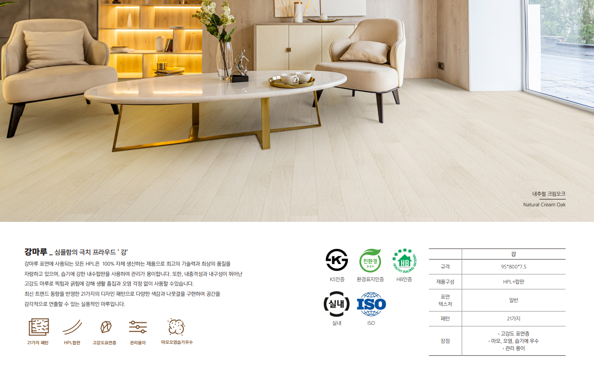 뛰어난 고강도 마루로 찍힘과 긁힘에 강해 생활 흠집과 오염 걱정 없이 사용할 수있습니다.