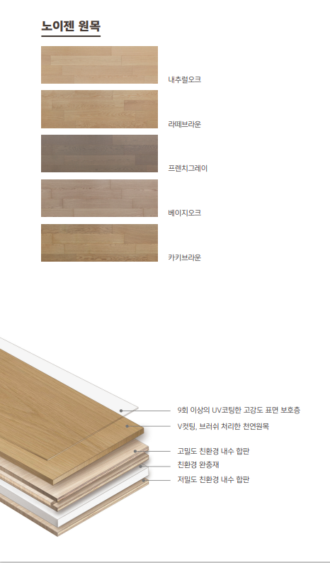 아니라 12가지의 고급스러운 천연 원목마루와 듀얼동조 마루의 다양한 디자인 패턴으로