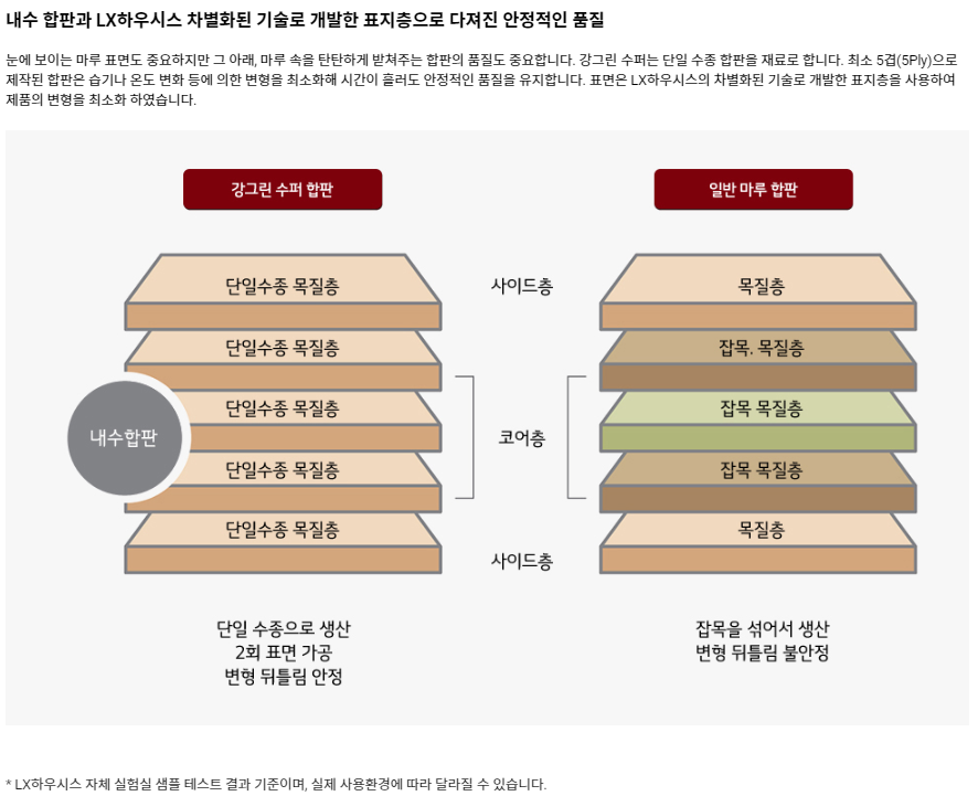 눈에 보이는 마루표면도 중요하지만 그 아래, 마루 속을 탄탄하게 받쳐주는 합판의 품질도 중요합니다.