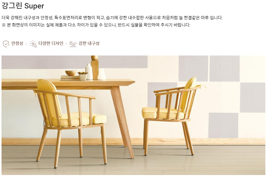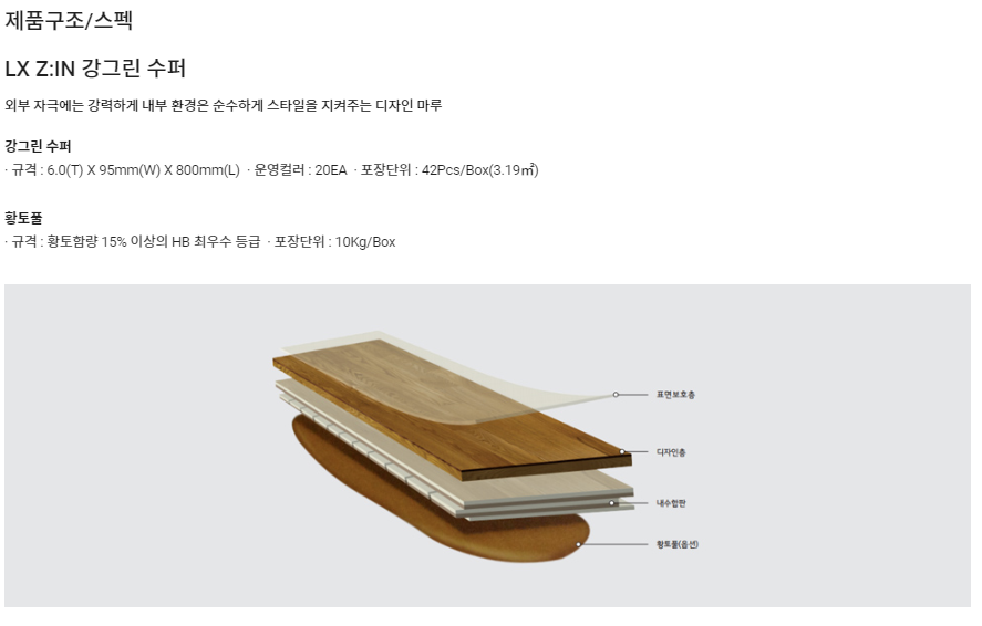강그린 슈퍼는단일 수종 합판을 재료로 합니다. 최소 5겹으로 제작된합판은 습기나 온도 변화 등에 의한